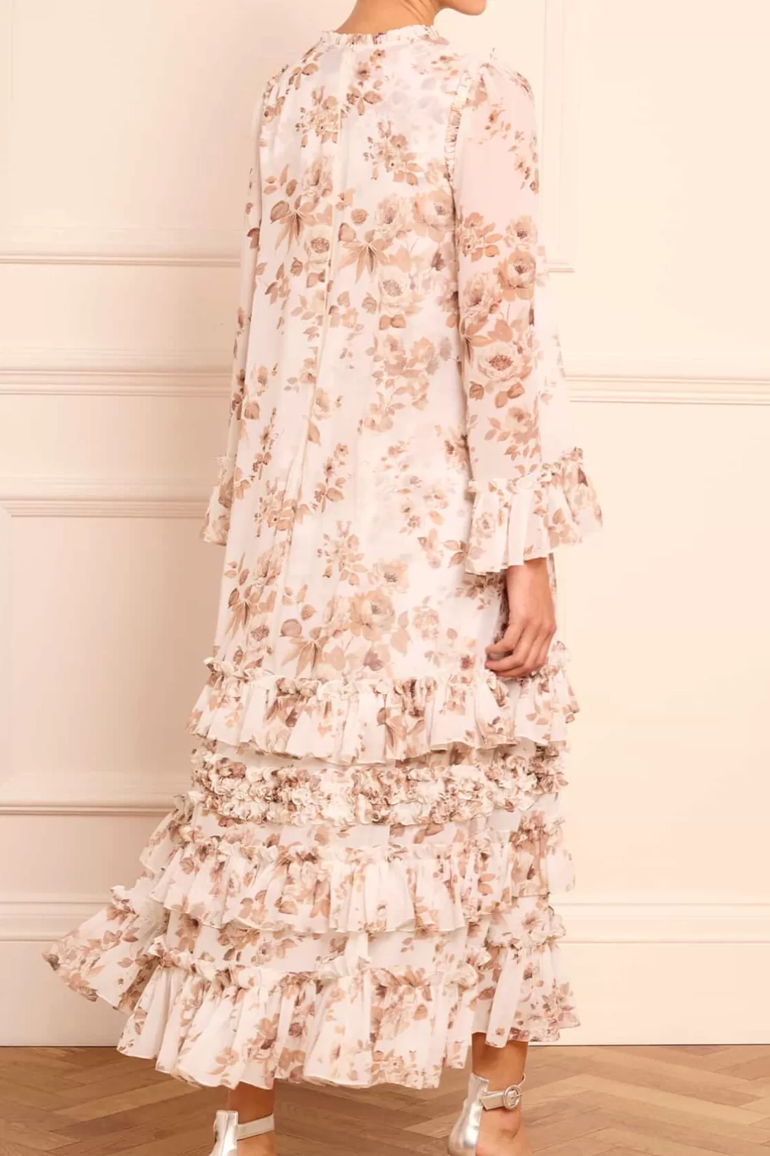 The Vintage Rose Chiffon Round Neck Ankle Gown in Moonshine. This dress features a beautiful romantic floral print inspired by hand-painted wallpaper from the 1800s, with soft tones of brown depicting whimsical floral bouquets. The effortless, loose-fitting silhouette is crafted in fine, soft chiffon, creating a romantic, floaty look. The semi-sheer chiffon fabric is complemented by a stylish separate slip underneath, adding chic modesty to the design. Layered frills towards the hem showcase the Needle & Thread signature look, combining a relaxed yet statement style.
