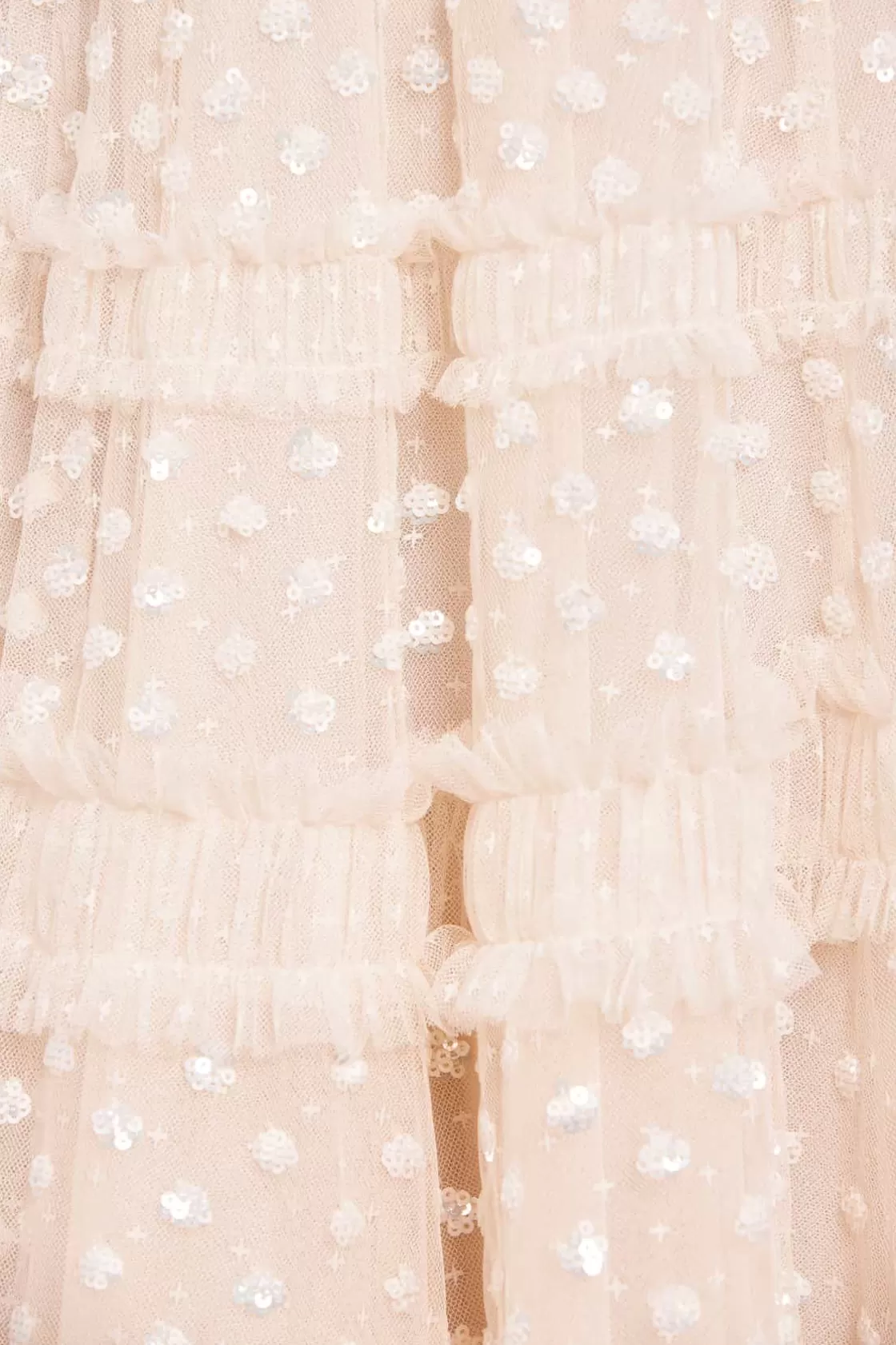 – Kisses tulle decorated with tonal scattered sequins and tulle ruffles